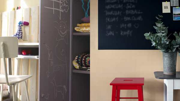 Tường bảng đen giúp tăng thêm sự vui tươi trong phối màu – nhưng cũng rất thực tế. Bọn trẻ có thể sử dụng nó để vẽ tranh hoặc luyện viết chữ, trong khi những đứa lớn hơn có thể dùng chúng để viết danh sách bài tập về nhà hoặc những thông điệp đùa giỡn từ bạn bè.